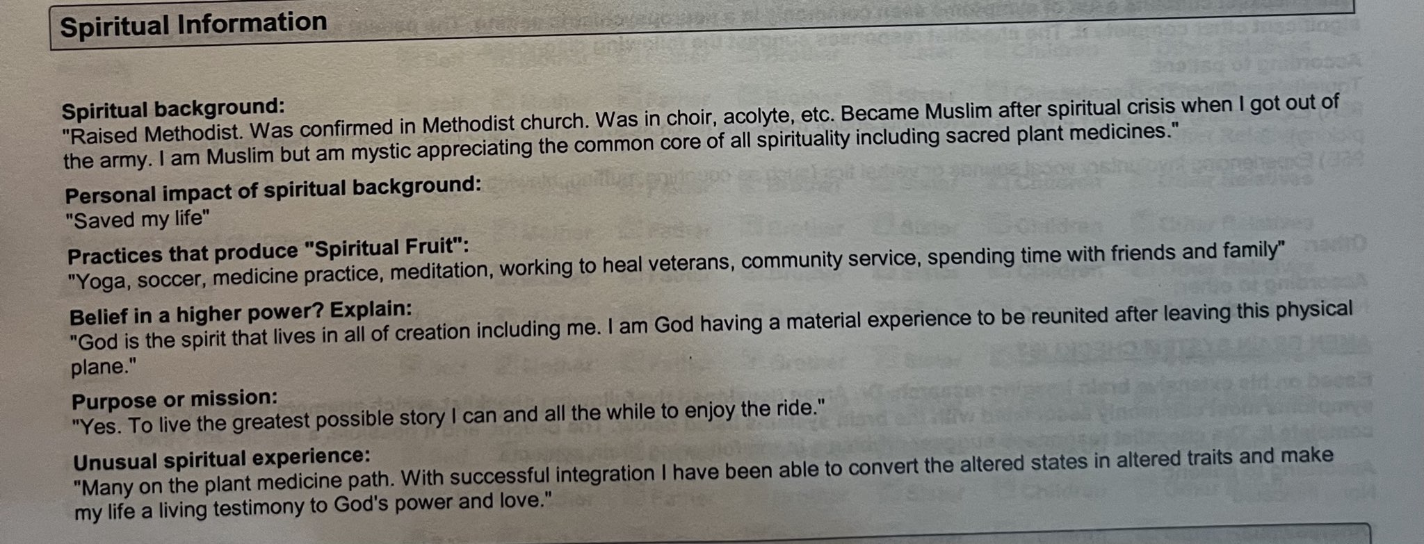 Utilized meditation, yoga and plant medicines including ayahuasca dozens of times and over 50 healing journeys with psilocybin.